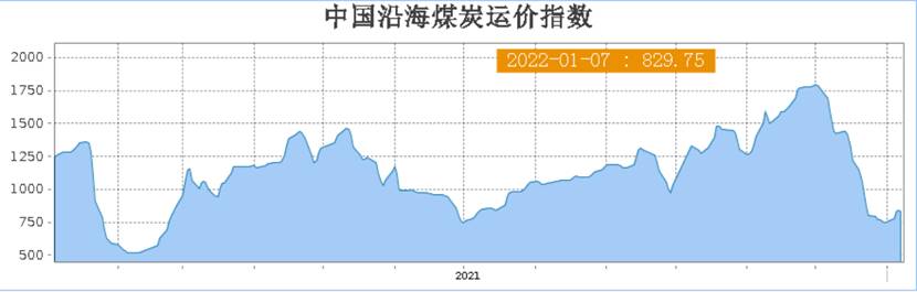 本周,沿海煤炭運(yùn)價小幅反彈。截至1月7日沿海煤炭運(yùn)價指數(shù)為829.75,較上周同期上漲80.84點,漲幅10.66%;較上月同期下跌854.67點,跌幅50.45%;較去年同期下跌427.92點,跌幅33.76%。